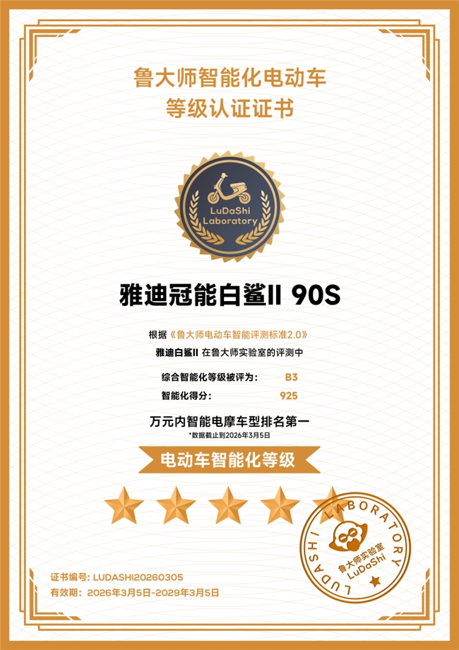 雅迪冠能白鲨Ⅱ的推出,也是雅迪推动行业智能普及和科技普惠的一次重要实践。在鲁大师最新发布的智能电动车排行榜中,雅迪冠能白鲨Ⅱ以925分的综合成绩斩获“万元内智能电摩排名TOP1”,但相比于一同上榜的一两万元的高端产品,雅迪冠能白鲨Ⅱ四千档的售价更接近两轮电动车的主流消费区间,将让更多用户享受到行业领先的智能体验,重塑消费者对智能电动车的价值认知。