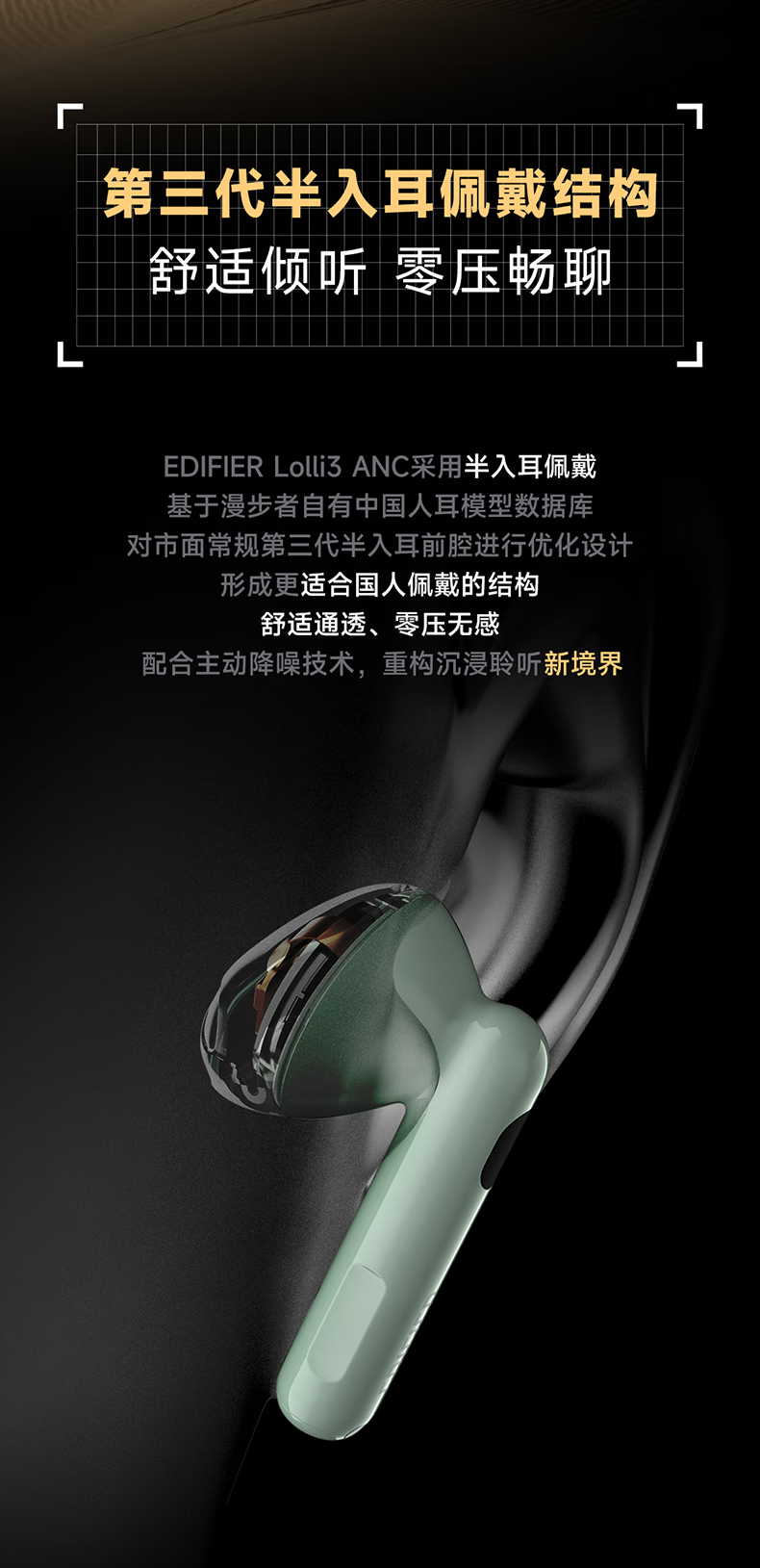 对于无法适应入耳式耳机的用户而言,半入耳设计的Lolli3 ANC提供了舒适与音质的最佳平衡点。它基于漫步者自有中国人耳模型数据库,优化了前腔设计。