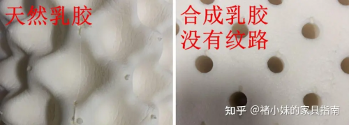 • 天然乳胶:取自橡胶树汁液,表面有如皮肤般皱纹般的纹理,扒开有细小的气孔,颜色呈微黄或淡黄色。 • 合成乳胶:天然乳胶中和化学原料加工合成的,表面光滑,强光下白得发亮,质感偏硬。