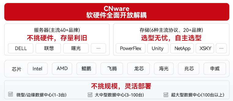 轻量化解耦交付模式:采用松耦合架构设计,产品可独立部署或灵活组合。该特性显著降低用户迁移成本:既支持纳管VMware存量资产,又兼容国产主流软硬件生态,最大化利旧现有设备。
