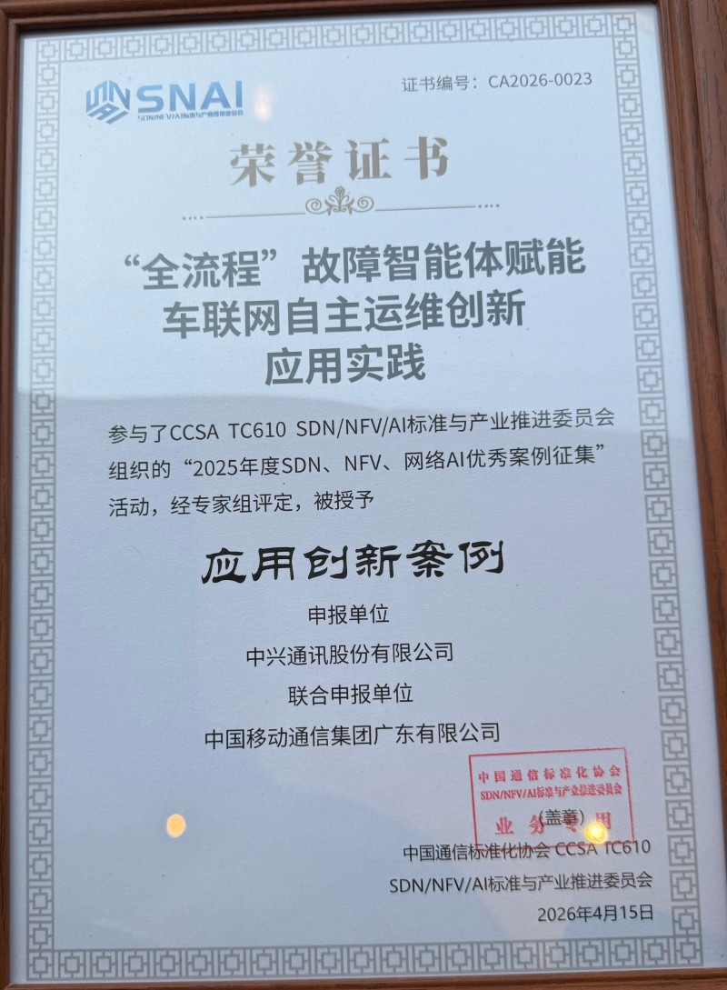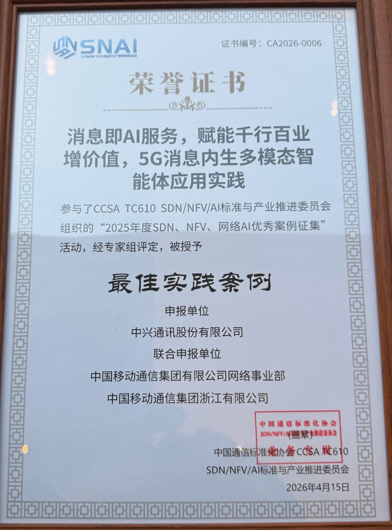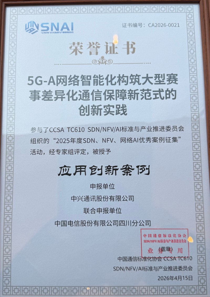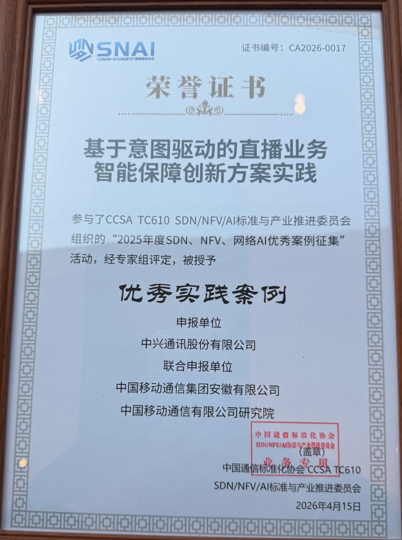 2026年4月15日,由SDN/NFV/AI标准与产业推进委员会主办的2025年度中国SDN、NFV、网络AI优秀案例征集活动揭晓评选结果。中兴通讯凭借在算网融合、智能体、5G-A、自智网络等领域的突出创新与规模化商用成果,一举摘得最佳案例奖1项、应用创新案例奖2项、优秀实践案例奖1项,共四项重磅大奖,充分彰显行业对其技术引领力、工程落地能力与产业价值的高度认可。