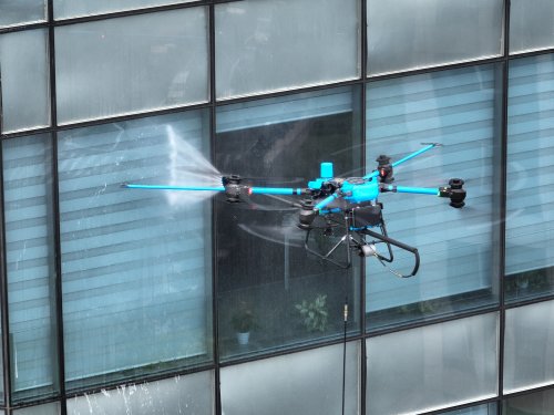 在作业现场,即便在大功率喷射高压水流时,C10清洗无人机依然保持稳定的悬停姿态。据技术人员介绍,这归功于自研的控制算法,能毫秒级修正后坐力,确保无人机始终靠近墙面,维持在最佳清洗距离。