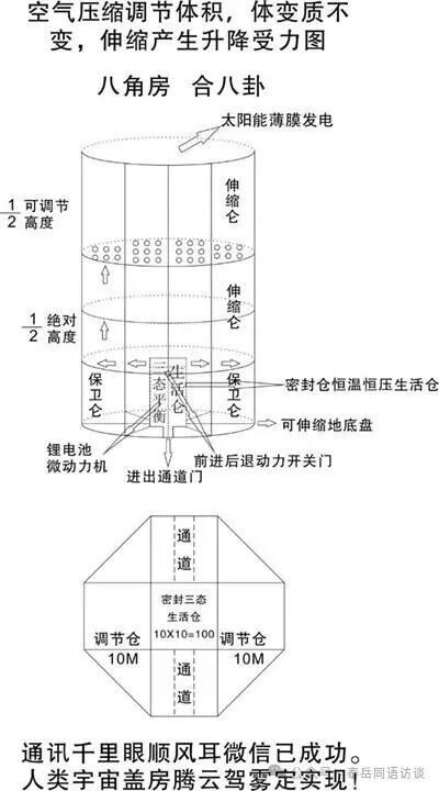 (4)人造天体八角方舟,目前可以利用地球大气层空气内外压力差升降运行。科技发展可以正负磁场,调节离心力和吸引力关系升降运行。科学发展而可以改变最佳升降方法运行,宇宙天地遨游绝对可行。